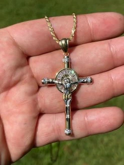 Solid 925 Silver Cross Jesus Pendant Yellow Gold Finish Iced Crucifix Necklace