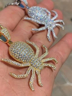 REAL Solid 925 Sterling Silver Spider Pendant Necklace Iced Gold HipHop Big 1.5″