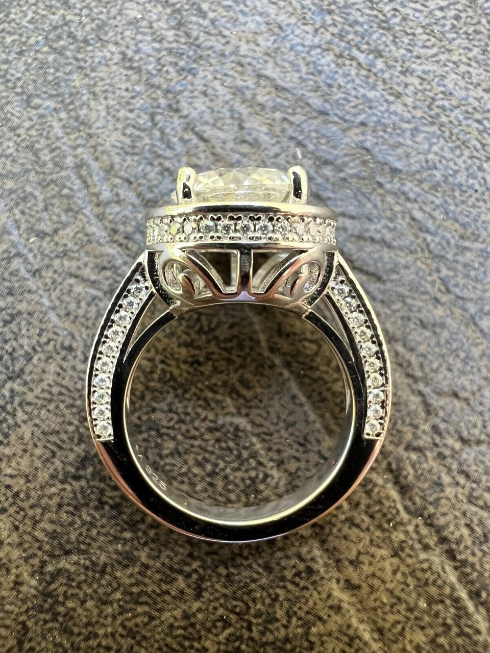 Large center moissanite stones with halo around it and smaller stones on all 3 sides of the band!