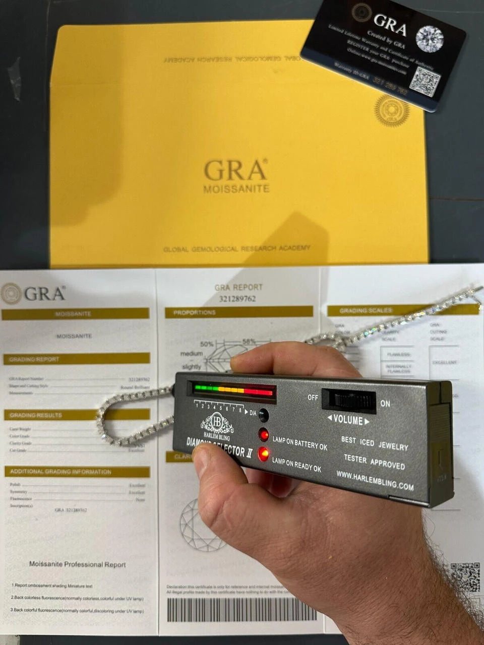 Hits on a diamond tester (shows “diamond” on basic tester and moissanite on more advanced testers)