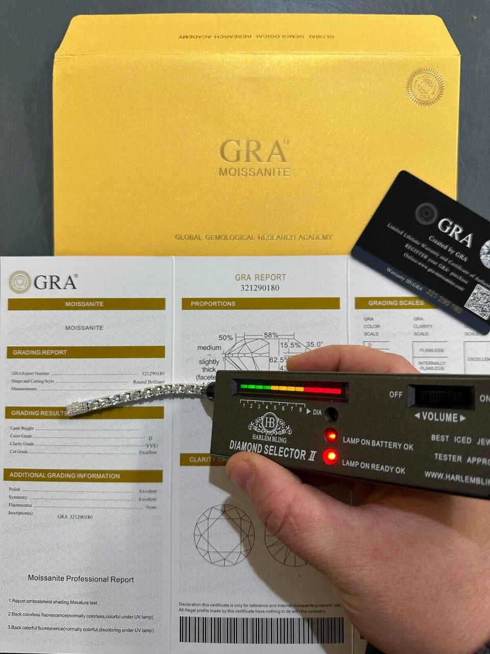 Hits on a diamond tester (shows “diamond” on basic tester and moissanite on more advanced testers)