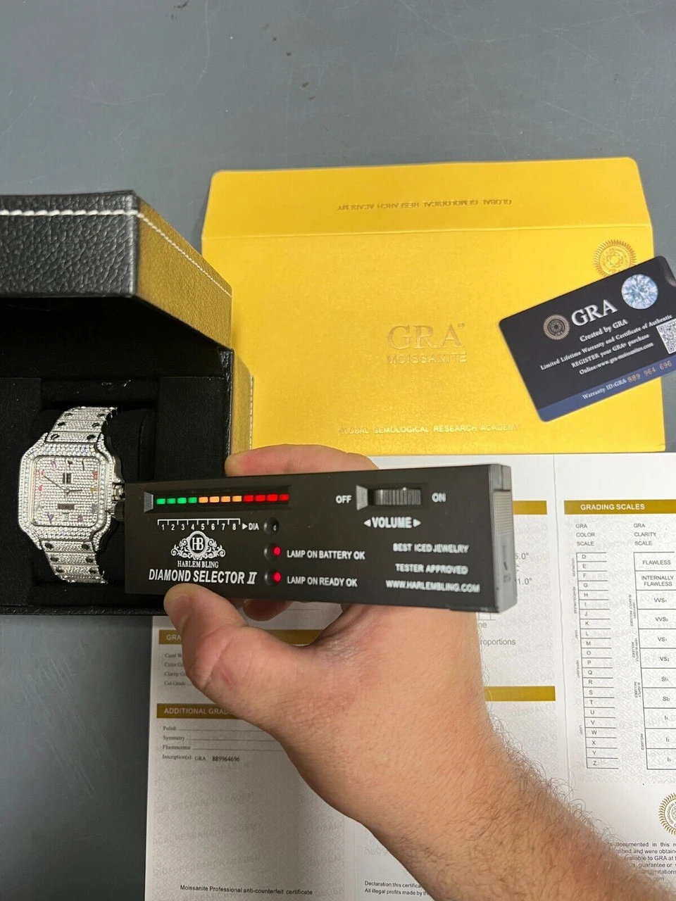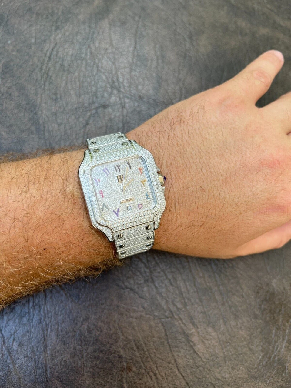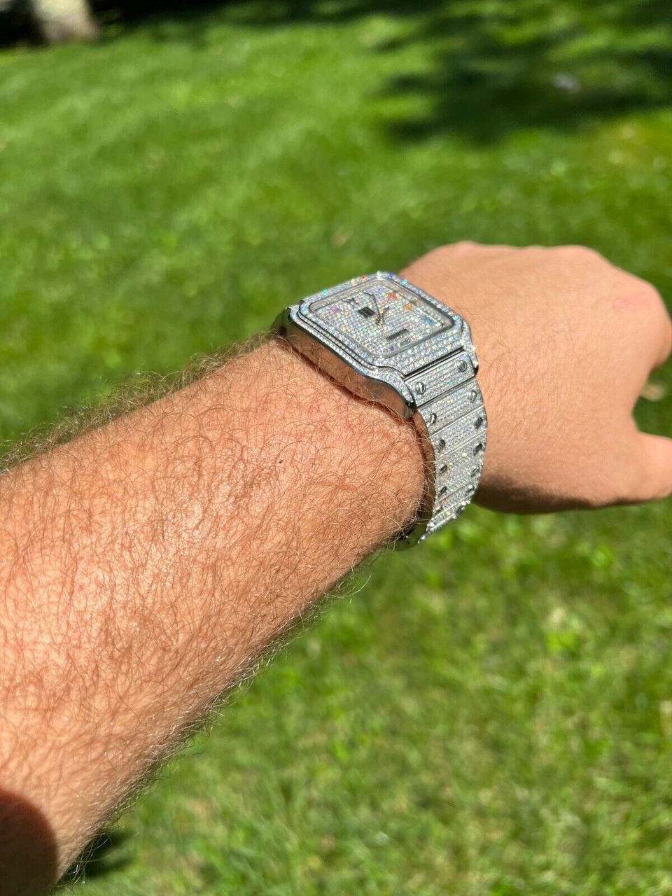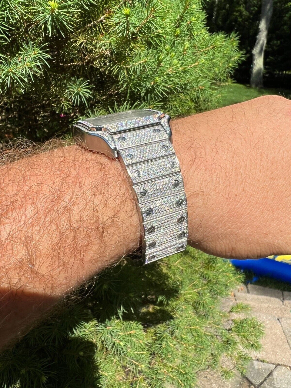 Iced face, bezel, dial, & bracelet with 16.1ct D color VVS real moissanite stones…large stones not small chips