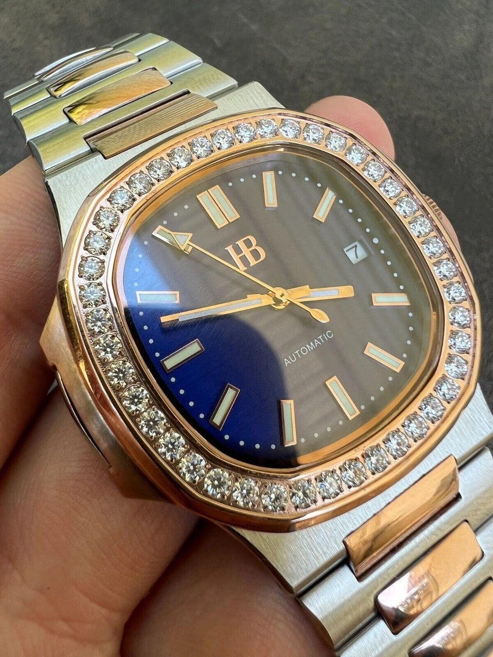 Real Stainless & 14k Rose Gold Iced 2ct Moissanite Plain Watch – Skeleton Back