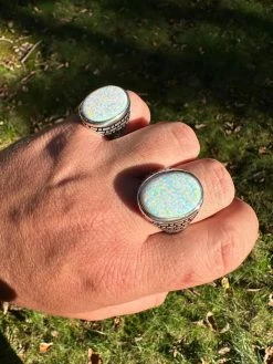 Real 925 Sterling Silver Lab Created White Fire Opal Gem Stone Ring Large Mens