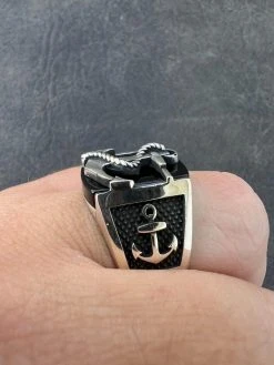 Mens Real 925 Sterling Silver Natural Black Onyx W. Anchor Sailor Maritime Ring